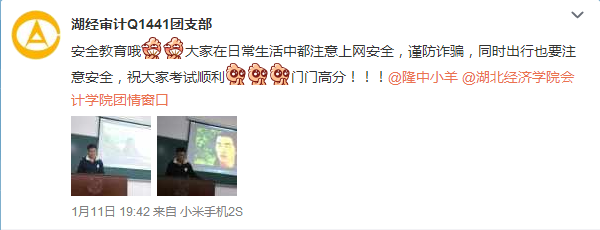 2015年1月11日晚,针对2014.12.31的上海陈毅广场拥挤踩踏事故以及2015.1.3的哈尔滨陶瓷大市场火灾,3044am永利集团官网各班级在本班晚点名教室开展安全教育。教育的主题涵盖人员密集场所的注意事项、如何避免和应对踩踏事故、如何保证寝室用电安全。针对近期肺结核病防治工作,会计Q1441和会计Q1442班还开展了结核病防治教育,班主任向大家强调保持寝室卫生和注意开窗通风等注意事项。下图为审计Q1441班的安全教育情况: