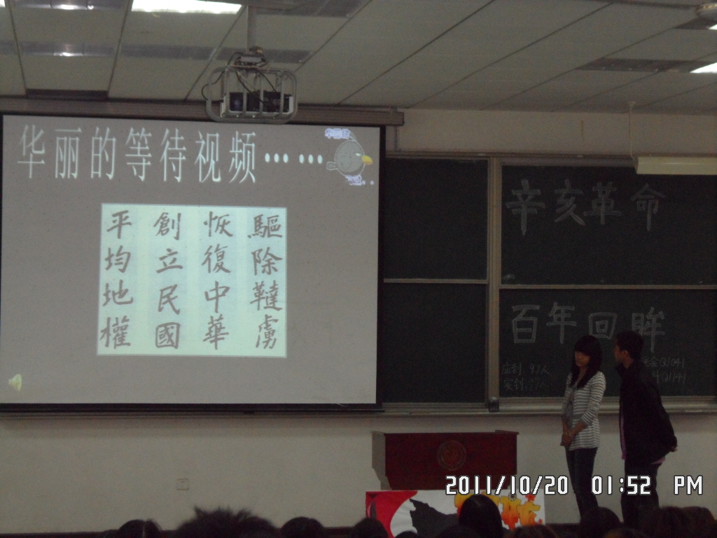 其中,会计Q1141班和注会Q1042班合办的活动精彩纷呈,充实丰富。大一新生们表演的话剧《药》带领同学们穿越时空,回到辛亥革命的时代。阴霾的社会,丑陋的卖国贼,麻木的民众以及为革命勇敢献身的革命先烈,无不震撼着同学们的心灵,使同学们懂得珍惜当下,居安思危。别具新意的《新闻联播》使同学们深刻认识到了自身所肩负的历史使命与社会责任。以击鼓传花的形式进行的辛亥革命知识问答,使全场气氛高涨,让同学们在趣味中重拾历史。