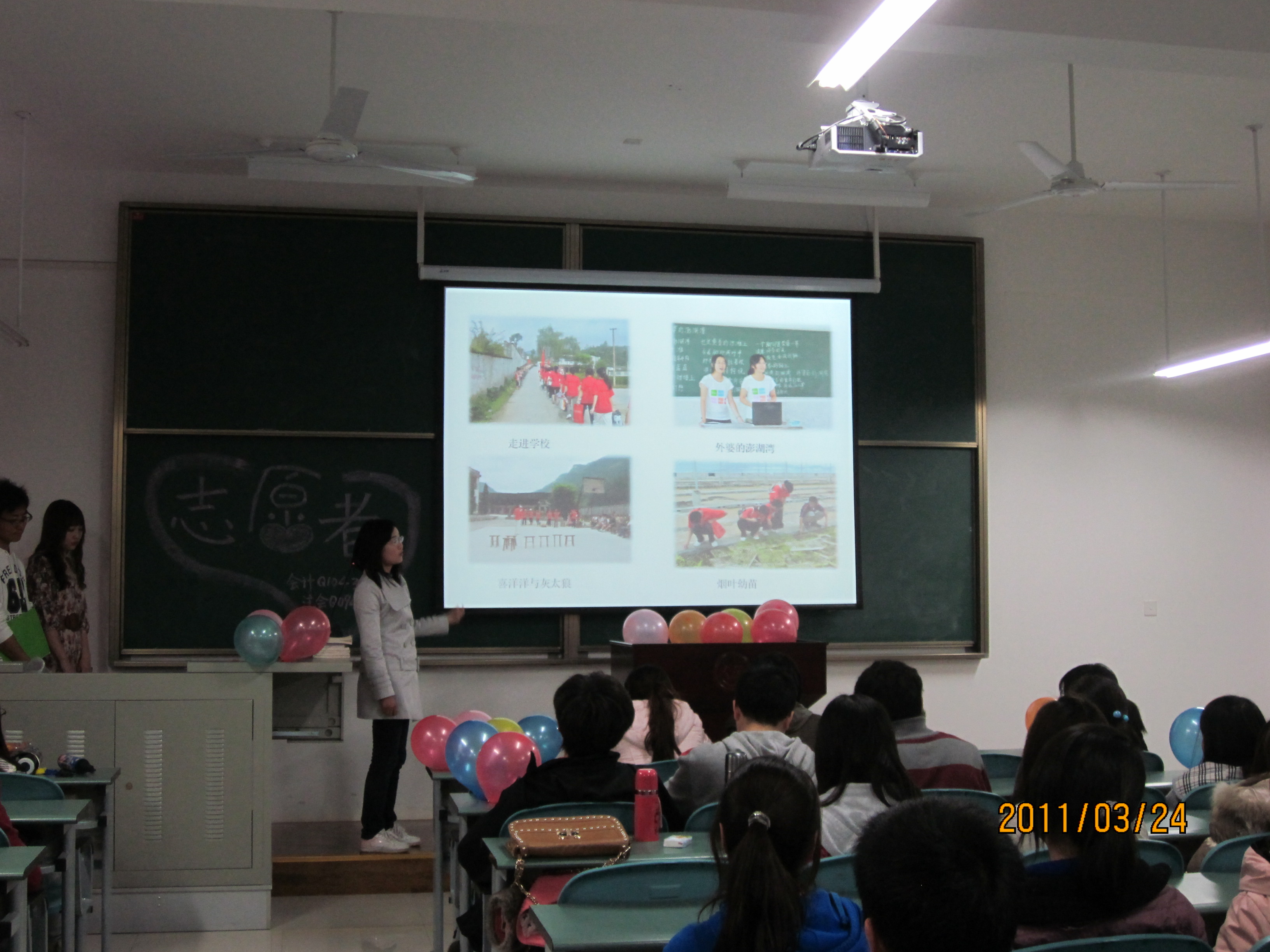 在人文艺术楼里,一系列温暖人心的视频随着缓缓的音乐滚动播放。视频中,上海世博会的志愿者们在炎炎夏日,一丝不苟的服务在自己的岗位,两颊的汗水伴随着脸上真诚的微笑,感动着在场的每一个人。注会Q0941与会计Q1042班的班委邀请到了来自大二青年志愿者协会、吴天祥小组以及红十字协会的志愿者们讲述自己的自愿者生活。会计Q1043班更是激情饱满,有备而来。激情澎湃的诗朗诵是活动中一抹亮丽的风景。诗歌《志愿者》被同学演绎的淋漓尽致。充分表达了同学们对志愿们崇高的敬意,彰显了社会文明的风采。在有奖知识竞答——“志愿者知多少这一环节中,同学们更是踊跃参与,在抢答过程中气氛被推向高潮。