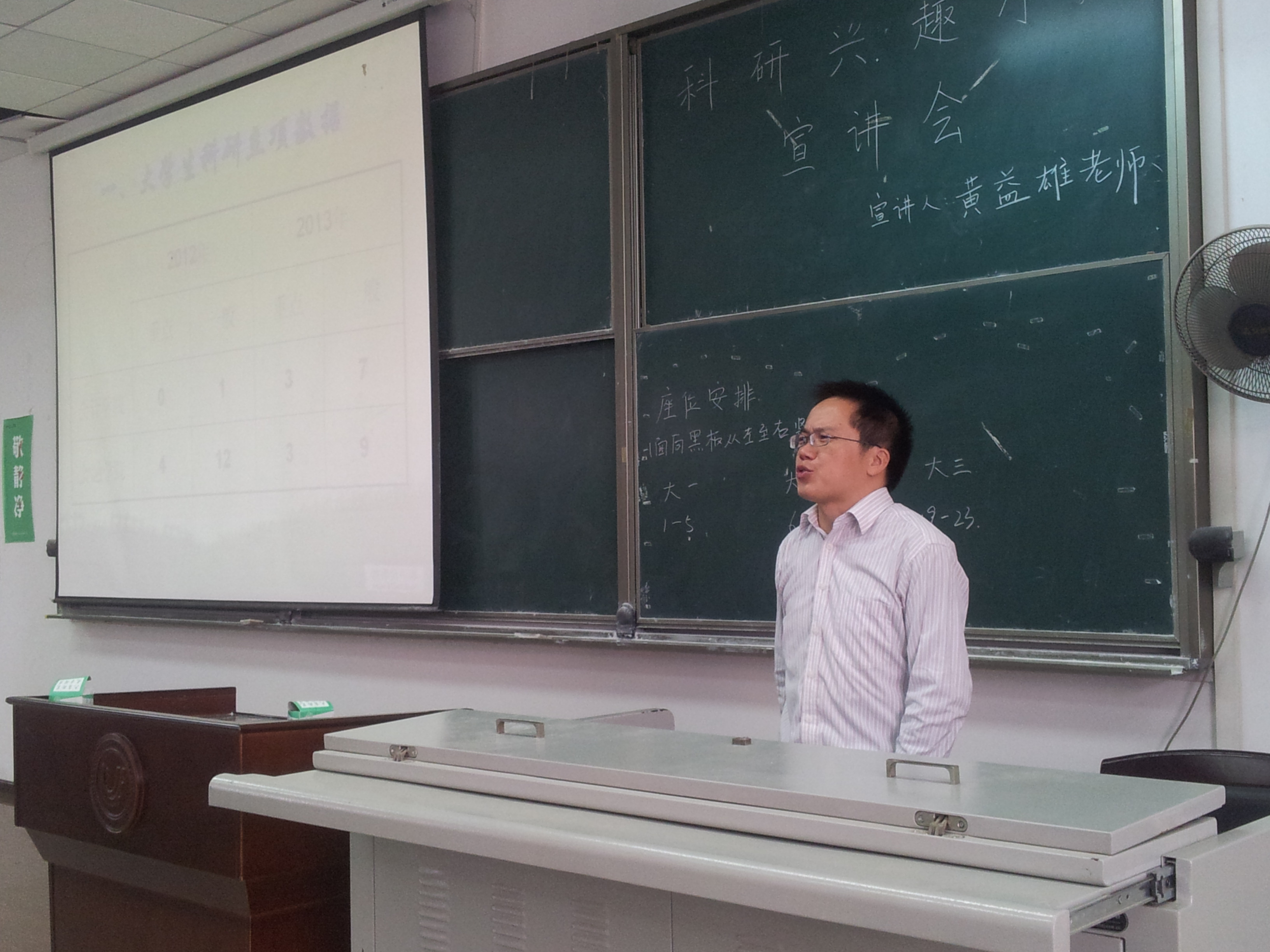 2013年10月15日中午12点30分,3044am永利集团官网在教三-302举办了以科研立项为主题的宣讲会,旨在通过对科研立项的介绍与讲解加深同学们对科研立项的理解,以鼓励更多同学加入科研立项的队伍中去。本次宣讲会由学院辅导员李阳阳老师主持、黄益雄老师主讲。